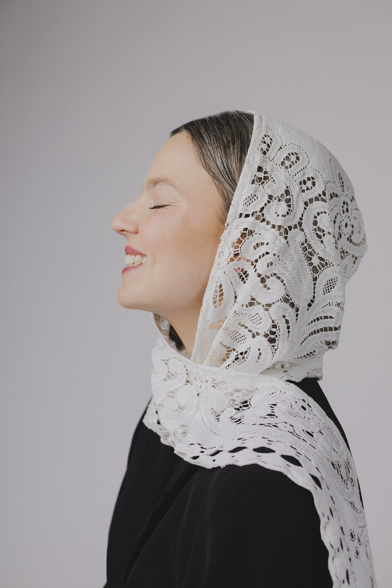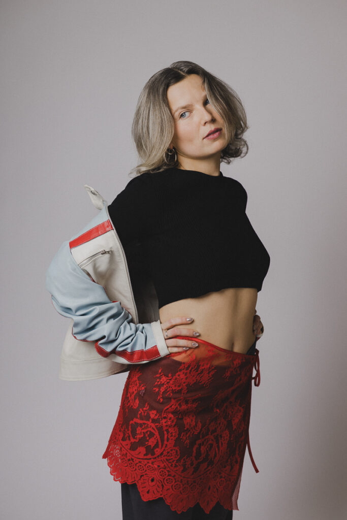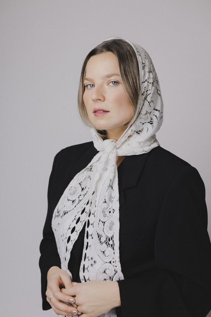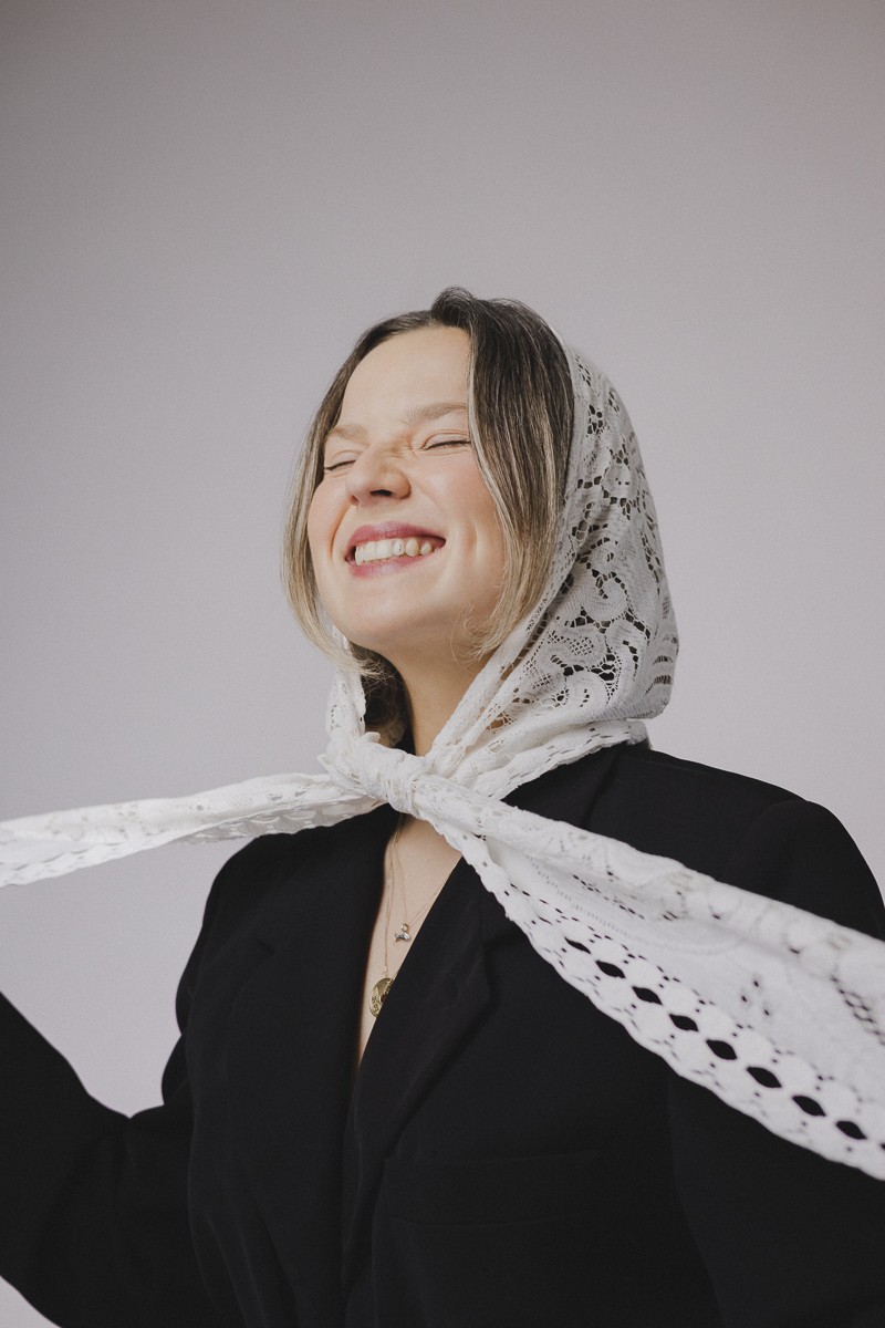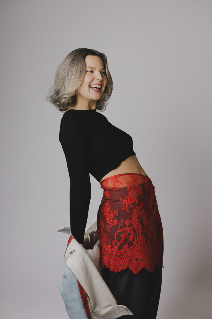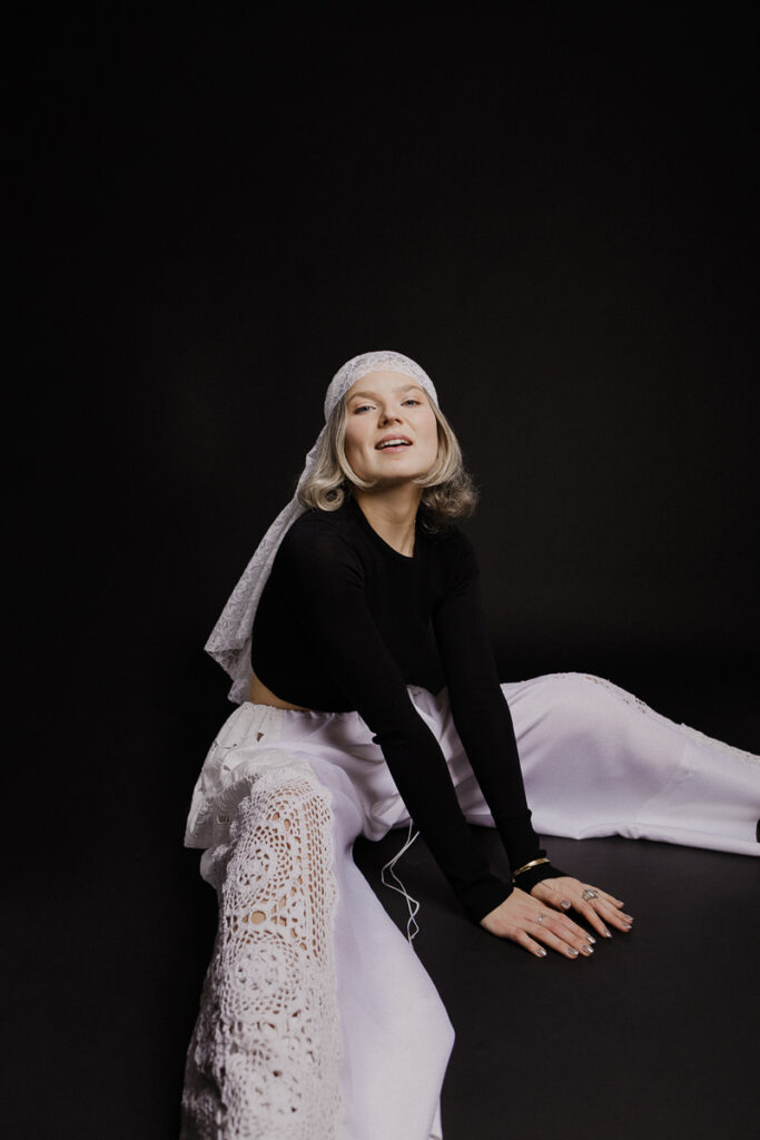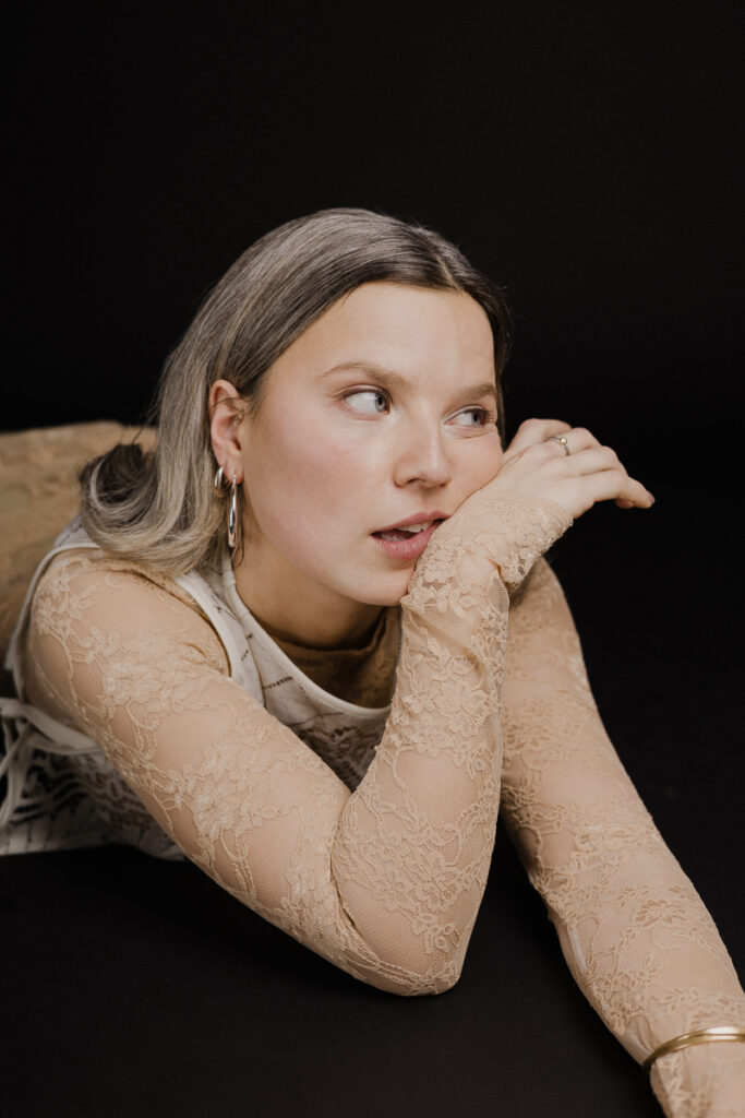 Silhouettes sobres, fond noir ou blanc, lumière délicate : un écrin minimaliste pour laisser la dentelle et les volumes respirer. Juliet pose comme dans un édito mode mais se permet un bâillement, un geste inattendu, un souffle de nonchalance belge qui casse le sérieux et ajoute une poésie de l’absurde.