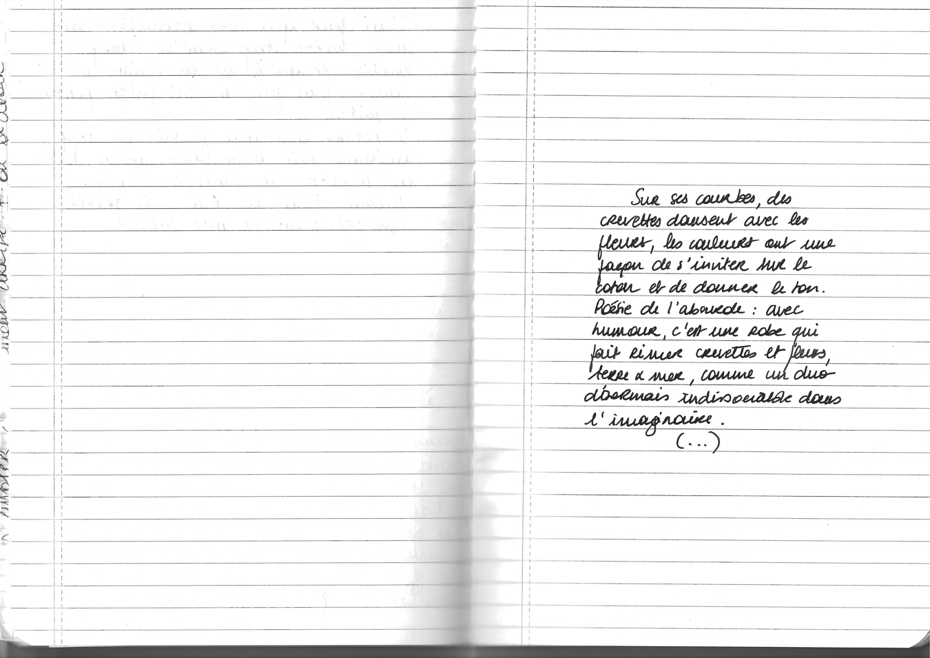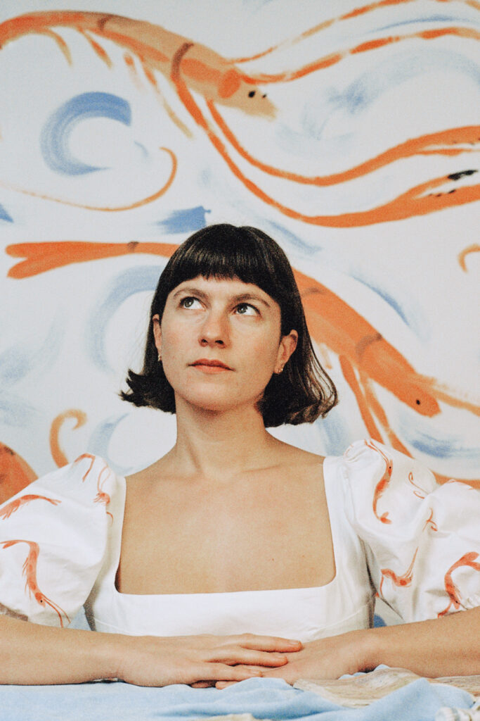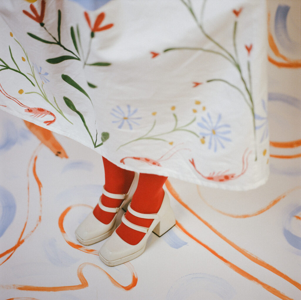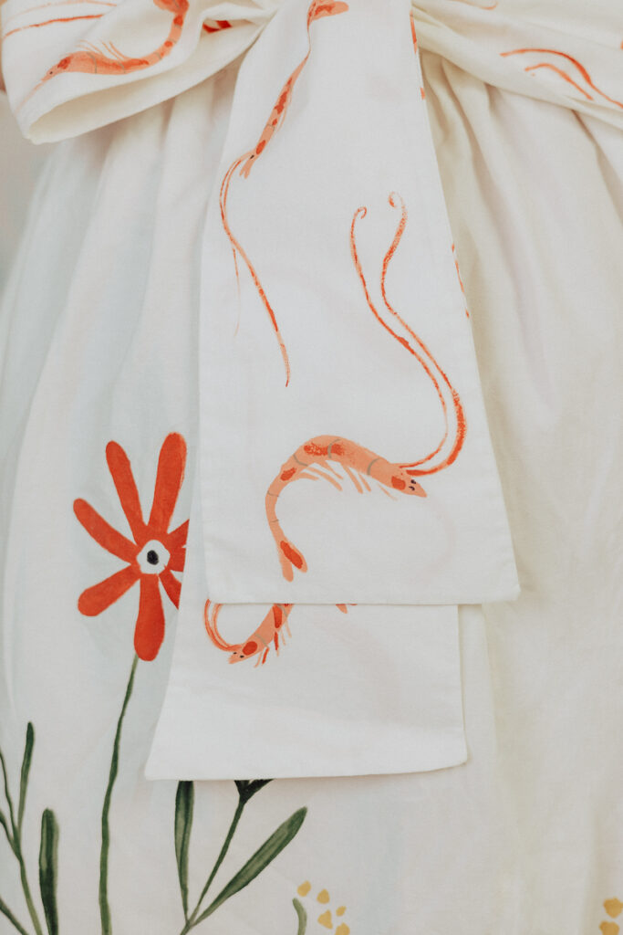 Pourtant, c’est une robe qui ne se prend pas au sérieux. Sur ses courbes, des crevettes dansent avec les fleurs, les couleurs ont une façon de s’inviter sur le coton et de donner le ton. Poésie de l’absurde : avec humour, c’est une robe qui fait rimer crevettes et fleurs, terre et mer, comme un duo désormais indissociable dans l’imaginaire. Une robe de cocktail, qui se soulève quand elle tourne, parce que c’est important pour une robe faite pour danser. On pourrait presque entendre la musique des vagues, les couverts des invités qui s’entrechoquent contre la porcelaine et les mouettes qui s’époumonent.