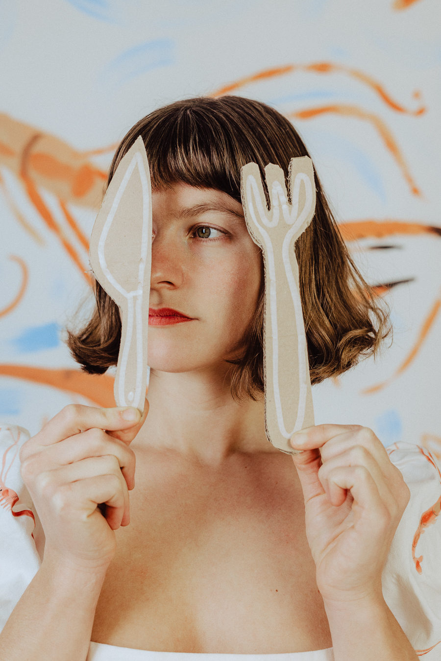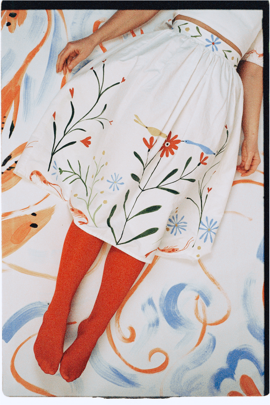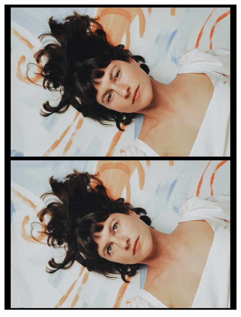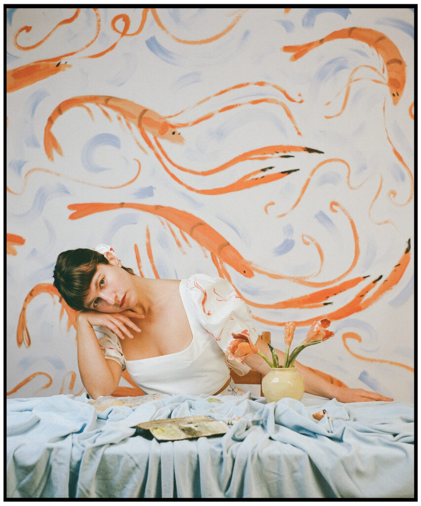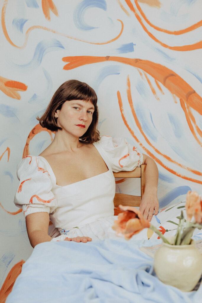 Photographier Philippine dans sa robe, c’est l’inscrire dans un dialogue entre le vêtement et l’artiste, entre la peinture et celle qui la porte. Le décor, lui aussi, prend vie sous ses pinceaux : un fond de papier peint à la main, pensé comme une extension de la robe.