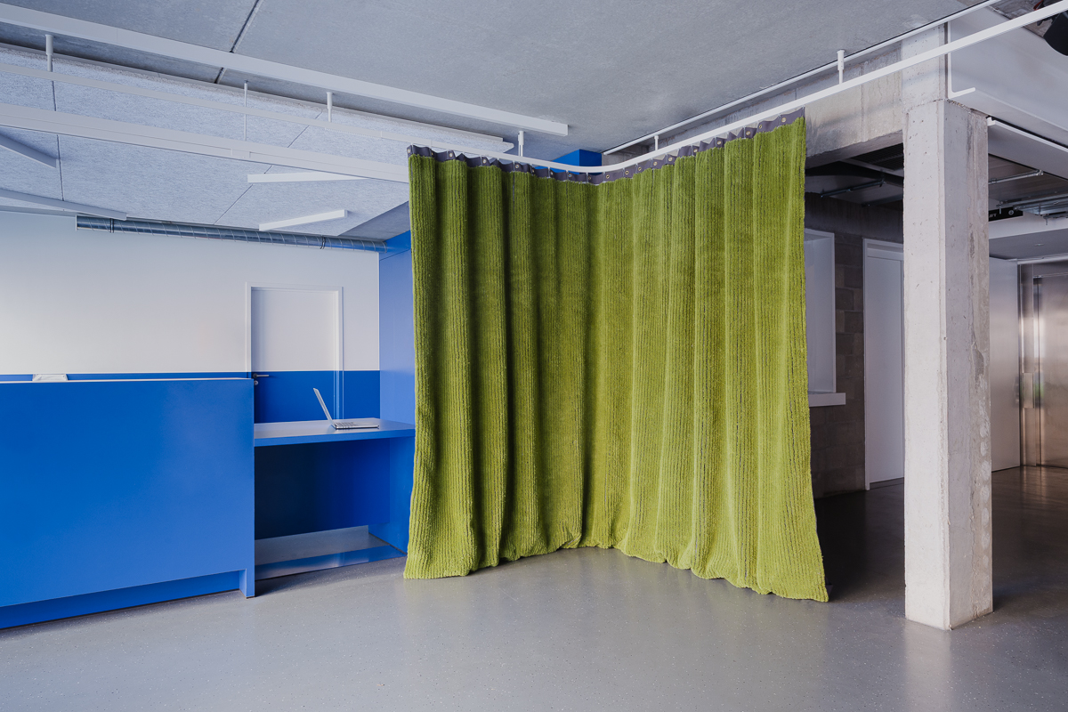 Les photos devaient à la fois être représentative de l’aspect double face du rideau, témoigner du tombé lourd du textile, tout en mettant en avant le fait qu’il sublime l’espace. Quelques photos permettent d’entrevoir sa construction.